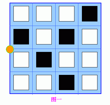 有一个n*n的网格,每一“格”上有一个可以翻转的方块,方块的两面分别涂成黑、白两种颜色。另外,有一个沿着网格线活动的东西——不妨称之为“动子”。初始时,每个方块随机地被翻成黑或白色,“动子”停在网格线的某个顶点上。例如如图一就是一个4*4的网格的一种可能的开局情况。