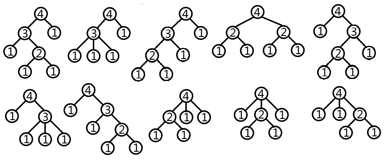 给出一个整数s,你能求出根节点权值为s的神犇多叉树的个数吗?请参照样例以更好的理解什么样的两棵多叉树会被视为不同的。