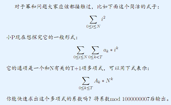 T<=2000,所有系数为小于1e+9+7的非负整数。