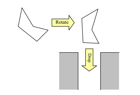 为了简化这个问题,我们考虑一个二维的空间。垃圾管道是一个有着固定宽度、垂直下降的槽。物体可以看作一个多边形的模型。在物体落入管道之前它可以旋转来达到和管道最佳拟合。当它下落时,它会垂直落下并且不再旋转。下图展示了一个垃圾是怎样旋转来符合管道的。