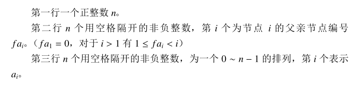 数据均为随机生成,即节点i的父亲是从1到i-1中随机选取的。a1至an是一个0至N-1的随机排列