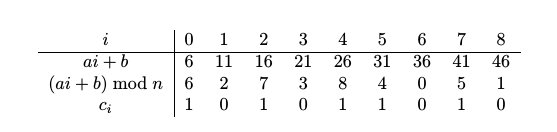 给定n,a,b,p,其中n,a互质。定义一个长度为n的01串c[0..n-1],其中c[i]==0当且仅当(ai+b) mod n < p。 给定一个长为m的小01串,求出小串在大串中出现了几次。