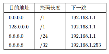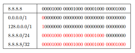 我们以报文的目的地址为8.8.8.8为例,说明其在上述路由表的匹配过程。
