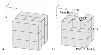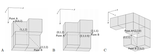 输入包含多组测试数据。每组数据的第一行包含六个整数,前三个整数表示一个在殖民地表面的点,后三个整数表示另一个在殖民地表面的点。保证两个点互不相同,且坐标在0到3之间。
