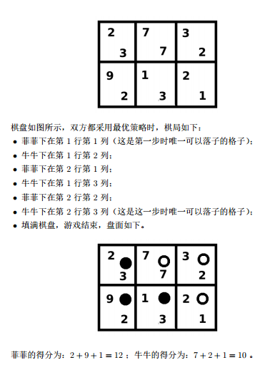 游戏结束后,菲菲和牛牛会分别计算自己的得分:菲菲的得分是所有有黑棋的格子上的Aij之和,牛牛的得分是所