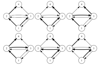 如果用箭头表示好友关系,下图展示了某个社交网络中消息转发的所有可能情况。